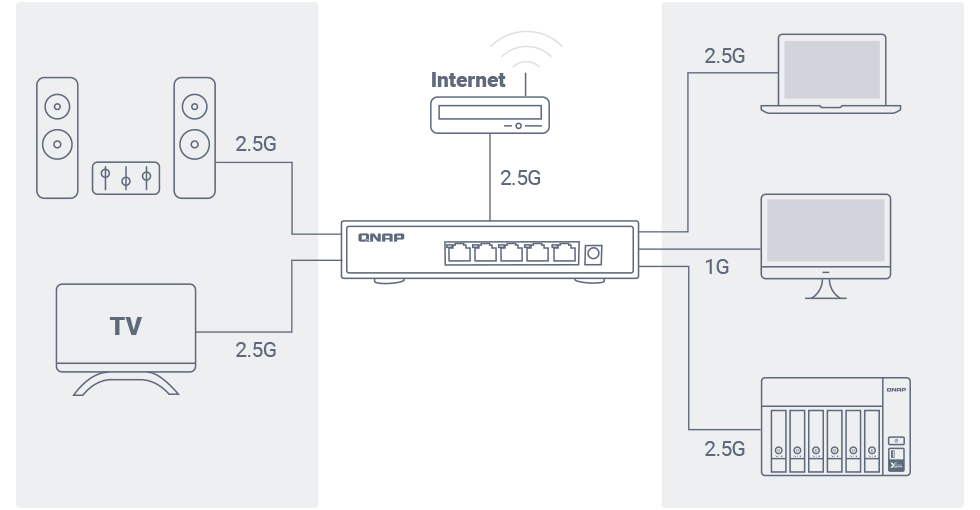 Kết nối mạng 2.5GbE mang lại cải thiện rõ rệt so với 1GbE tiêu chuẩn. QNAP cung cấp các switch 2.5GbE hỗ trợ Multi-Gigabit NBASE-T, cho phép bạn sử dụng cáp CAT5e hiện có để kết nối nhiều máy tính vào NAS Nhờ đó, doanh nghiệp có thể dễ dàng triển khai môi trường mạng tốc độ cao, an toàn và có thể mở rộng mà không vượt quá ngân sách.